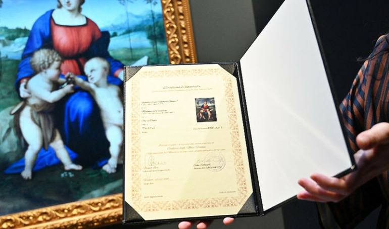 In this file photograph taken on February 15, 2022, a gallery assistant looks at a digital reproduction of the painting 'Madonna del Cardellino (Madonna of the Goldfinch' by Raphael, displayed…
